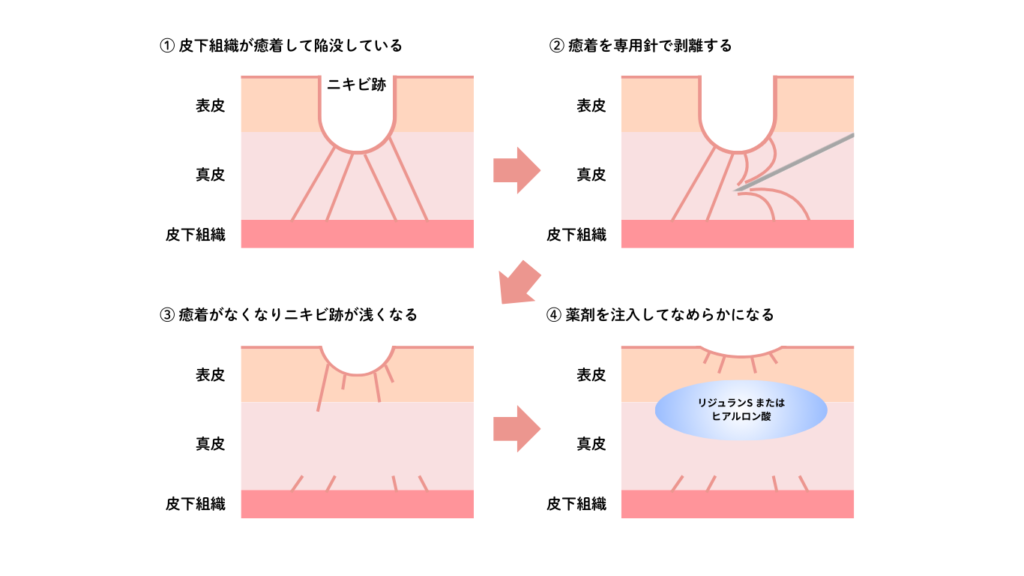 サブシジョンは、皮膚の内側で凹みを引き下げている瘢痕性の癒着(線維性バンド)を専用の針(カニューレ)で物理的に切り離し、凹みの改善と肌の再構築を促す再生型の治療です。