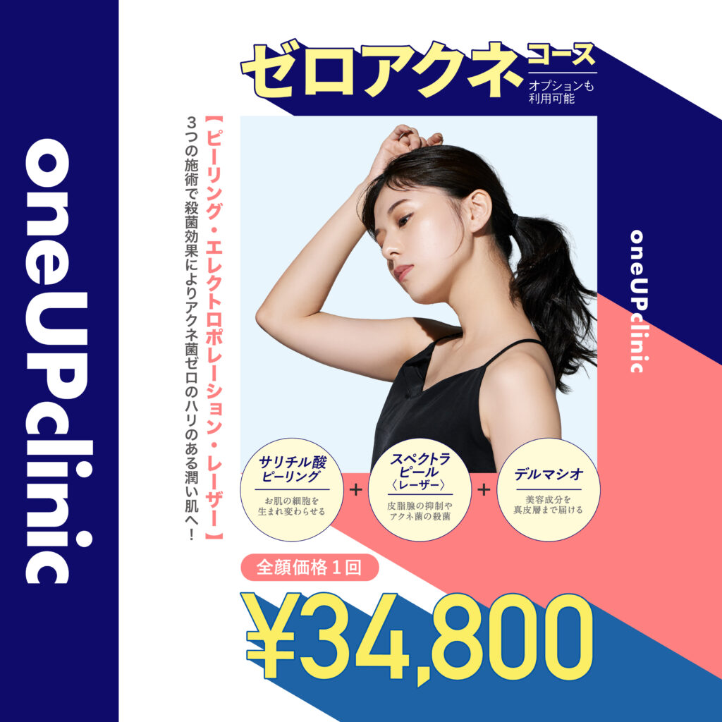 当院のゼロアクネコースは、サリチル酸ピーリング(初回価格9,000円)、スペクトラピール(初回価格13,200円)、エレクトロポレーション(初回価格16,500円)の3つの施術をセットで初回価格34,800円でお得に受けられるニキビを集中的にケアするコースです。3つの施術の相乗効果でニキビを改善し、みずみずしく健やかな素肌へと導きます。
